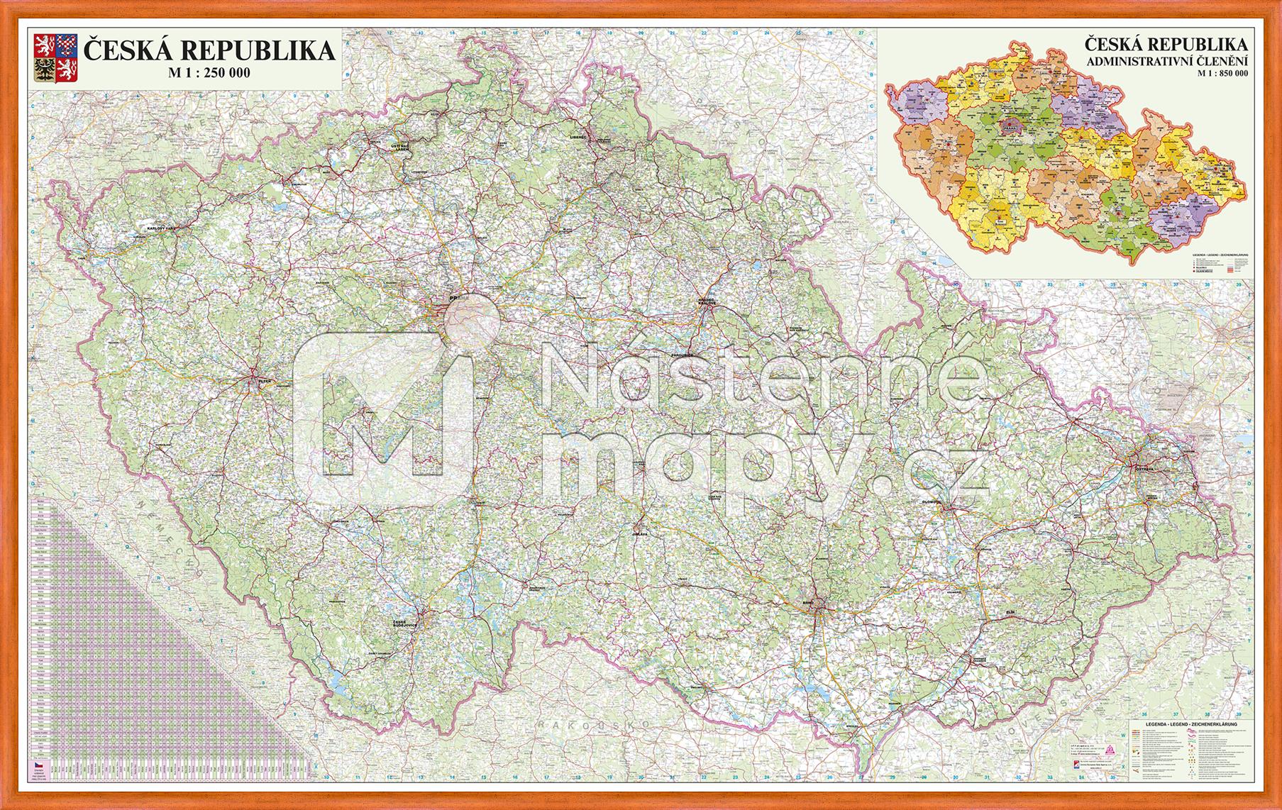 Pořízením mapy v masivním dřevěném rámů získáte luxusní interiérovou dekoraci. Do rámu je mapa zasazena laminovaná a kašírovaná - celoplošně strojově lepená na lehčené, přitom pevné desce. Zvolit můžete rám ze standardní nabídky. V případě požadavku na jinou barevnou variantu Vám rádi vyjdeme vstříc, aktuální nabídka rámů se průběžně mění.