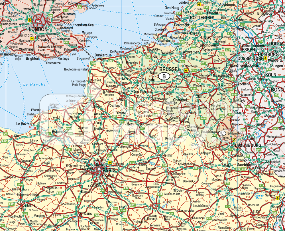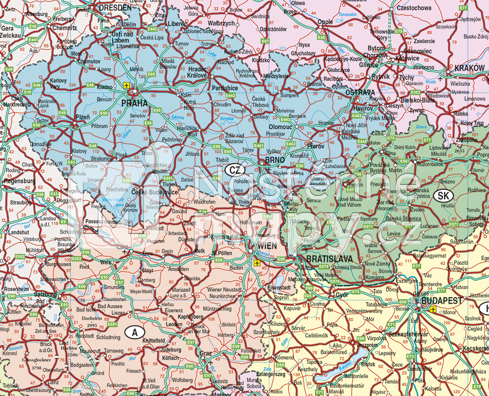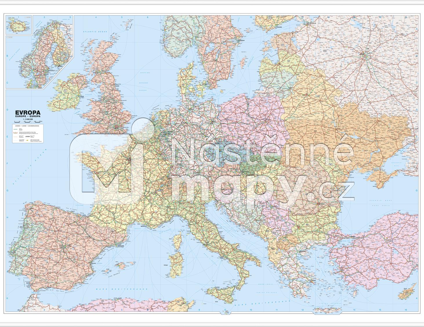 Politická mapa Evropy se silniční sítí v měřítku 1 : 3,6 mil. Rejstřík sídel ke stažení zde.