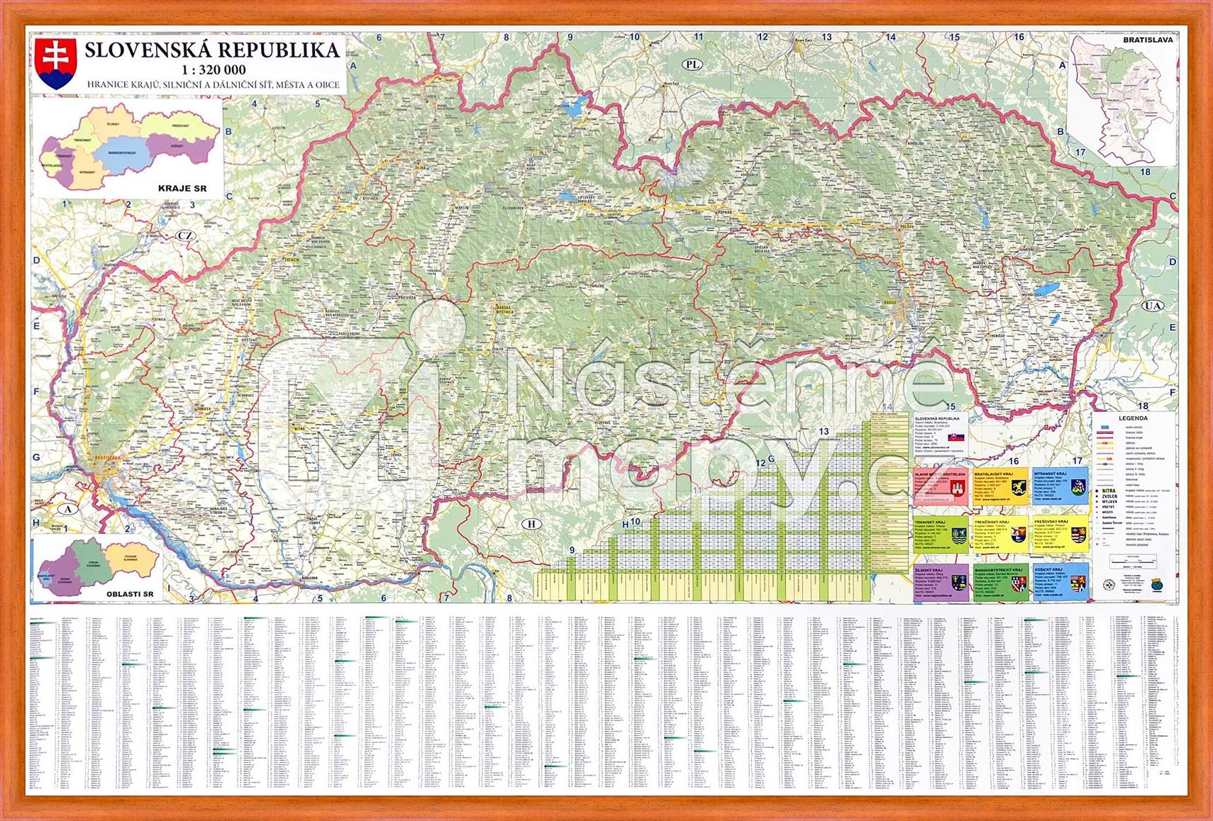 Silniční mapa Slovenské republiky v měřítku 1 : 320 000. Na mapě jsou vyznačeny i obce pod 150 obyvatel. Stínovaný reliéf, kilometrovník, rejstřík obcí.