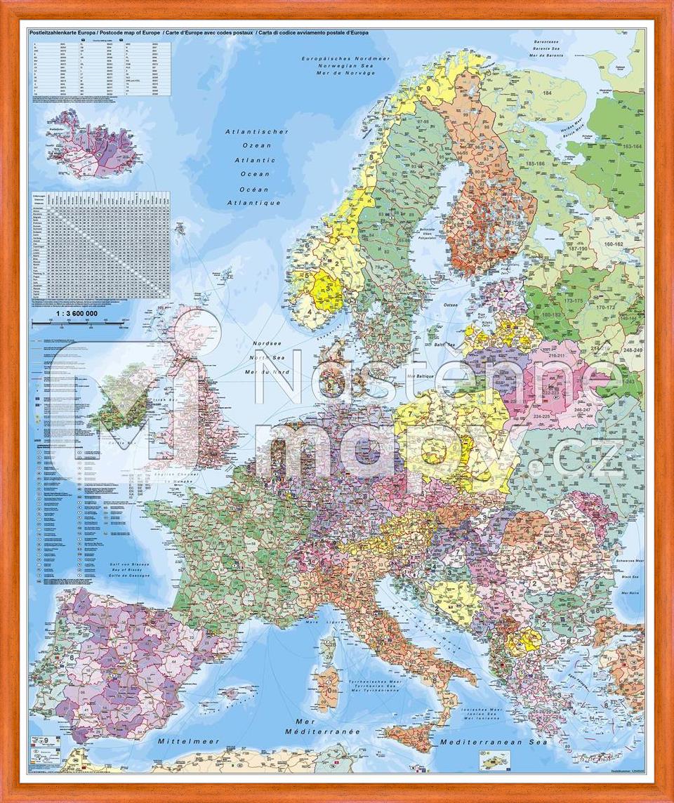 Mapa spediční Evropy s barevně odlišenými státy a vyznačenými směrovými čísly hlavních oblastí v jednotlivých státech. Na mapě jsou zobrazeny hlavní silniční tahy a kilometrovník.