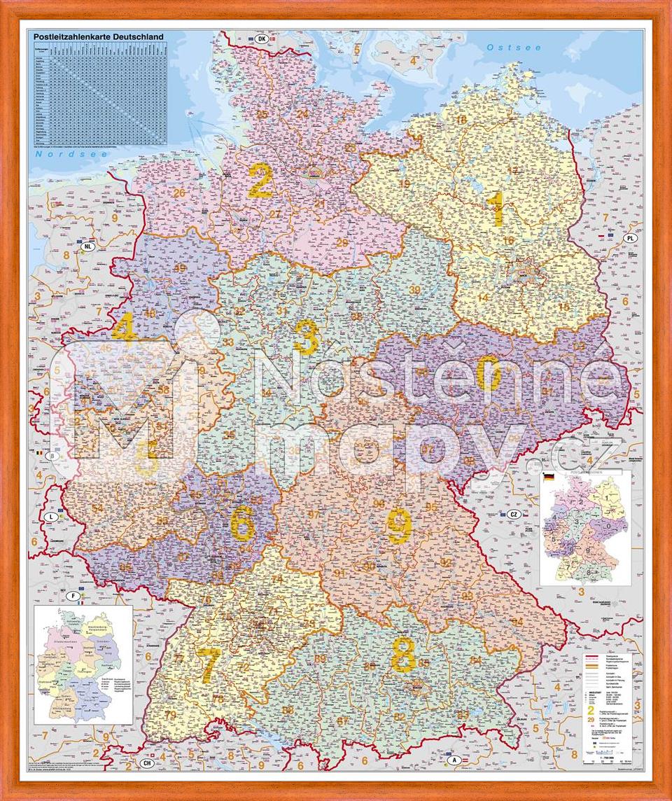Mapa Německa s barevně odlišenými spolkovými zeměmi a směrovými čísly. Rozměr 97 x 119 cm. Měřítko 1 : 750 000.