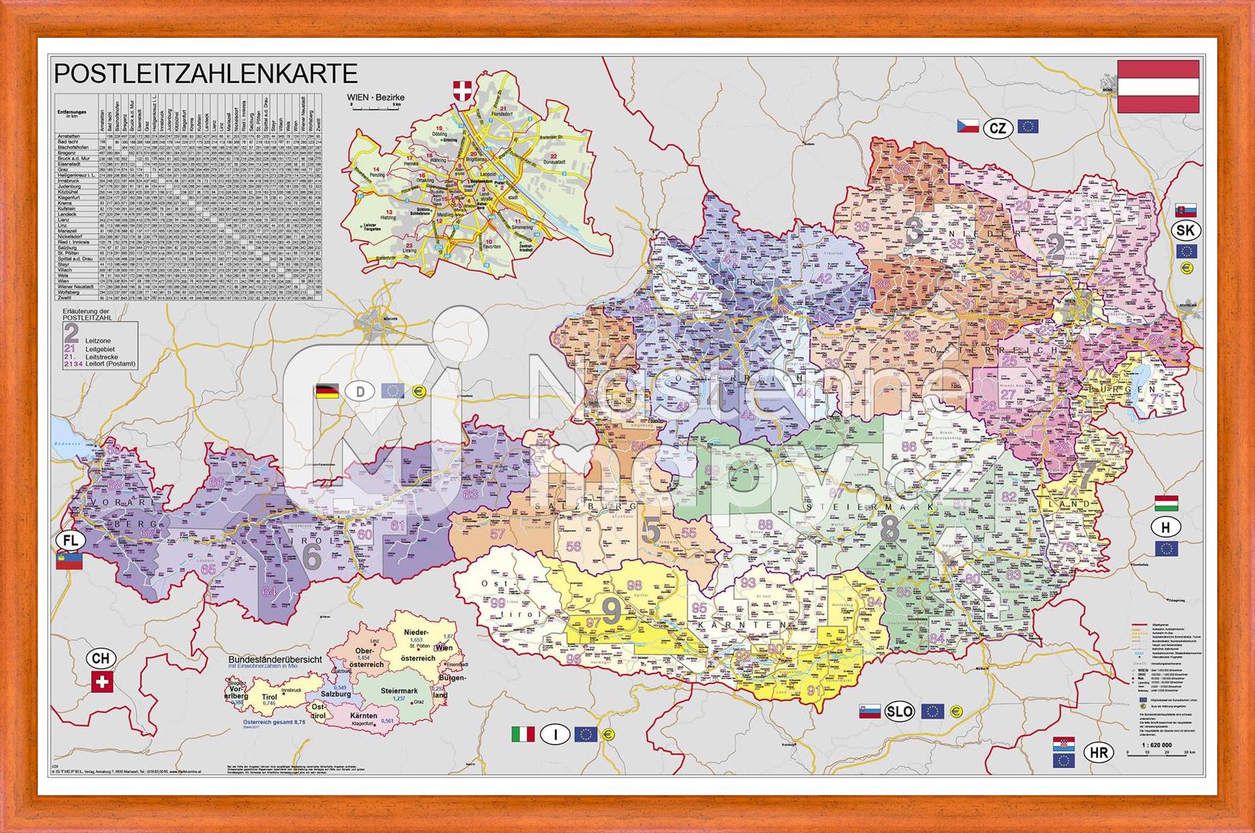 Mapa Rakouska s barevně odlišenými spolkovými zeměmi a směrovými čísly. Rozměr 95 x 61 cm.
