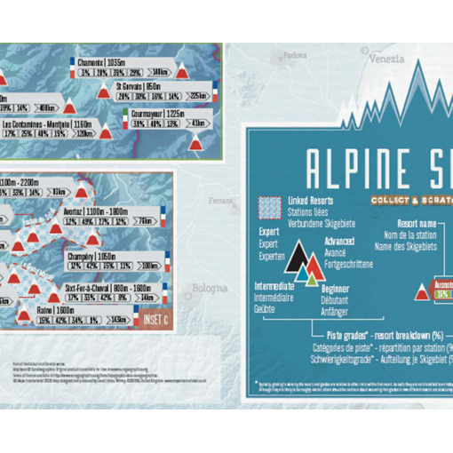 Mapa z kolekce „stíracích map“ zobrazuje 111 alpských lyžařských středisek. Každý zápis obsahuje název, nadmořskou výšku a stát, ve kterém se středisko nachází, spolu s úrovní sjezdovek (zelená, modrá, červená, černá) a jejich celkovou délkou.