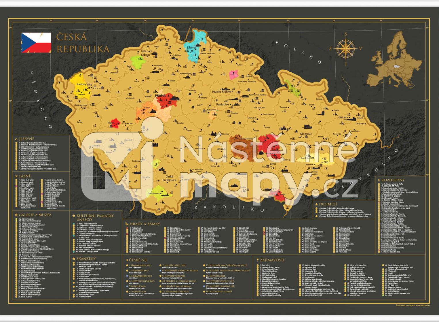 Stírací mapa České republiky v tmavém elegantním designu nejenom pro cestovatele, ale i jako skvělý dárek, který baví. Pod snadno stíratelnou vrstvičkou odhalíte nejzajímavější místa v Česku, jako jsou kulturní památky UNESCO, galerie a muzea, jeskyně, skanzeny, rozhledny a spousty dalších zajímavostí naší krásné země.Tato stírací mapa ČR je originální způsob, jak si uchovat vzpomínky na cesty, který si oblíbí celá rodina.