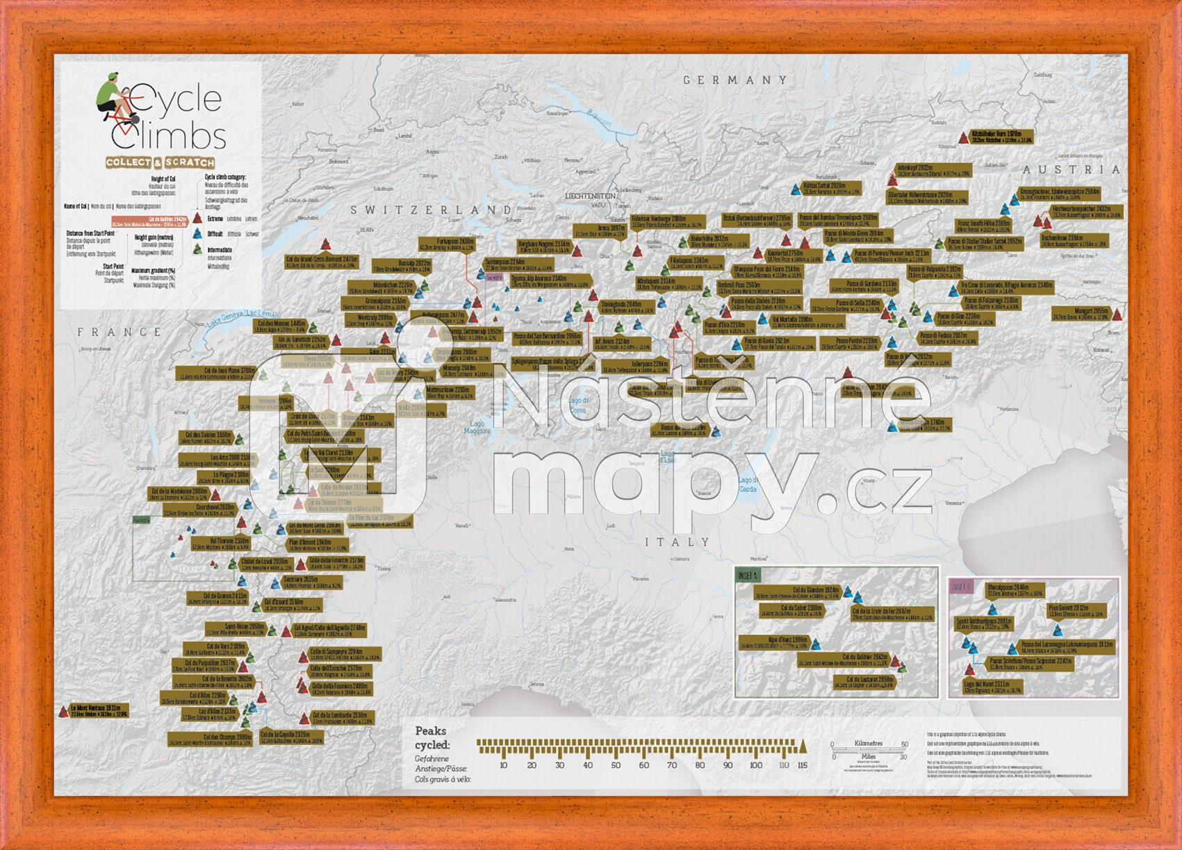Mapa ze série „stíracích map“ zobrazuje 115 cyklistických tras – výstupů napříč Alpami. Ikony vrcholů barevně rozlišují tři kategorie stoupání dle náročnosti (výškové metry, délka trasy, % stoupání).