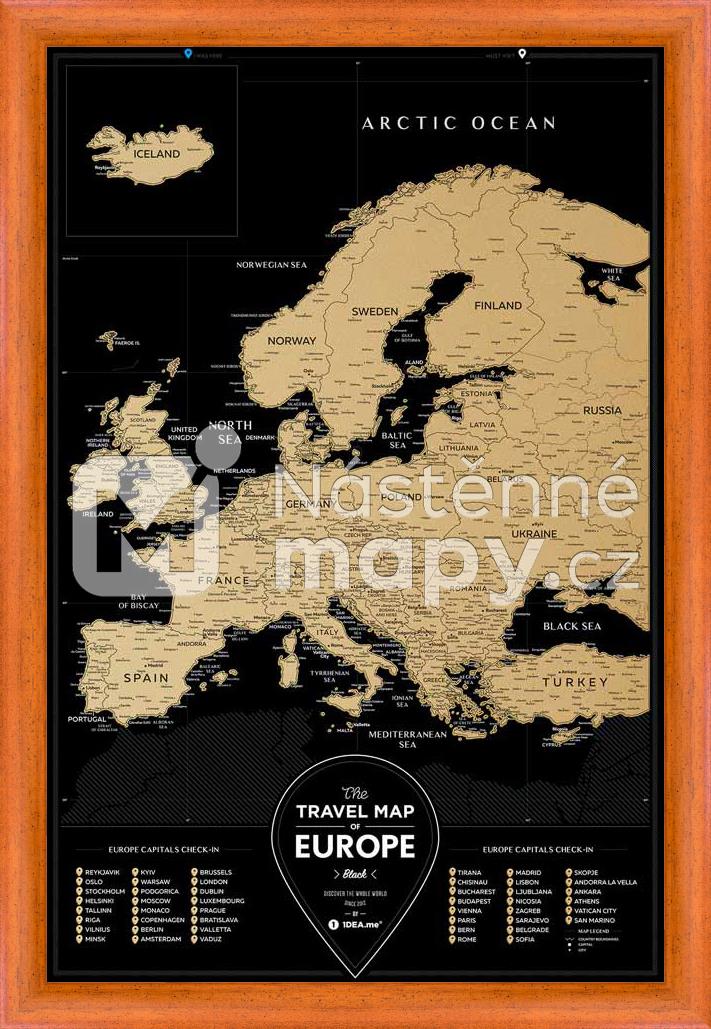 Travel Map Europe Black je luxusní stírací mapa pro cestovatele, kteří se vydávají poznávat přírodu, města a památky nejraději po Evropě.