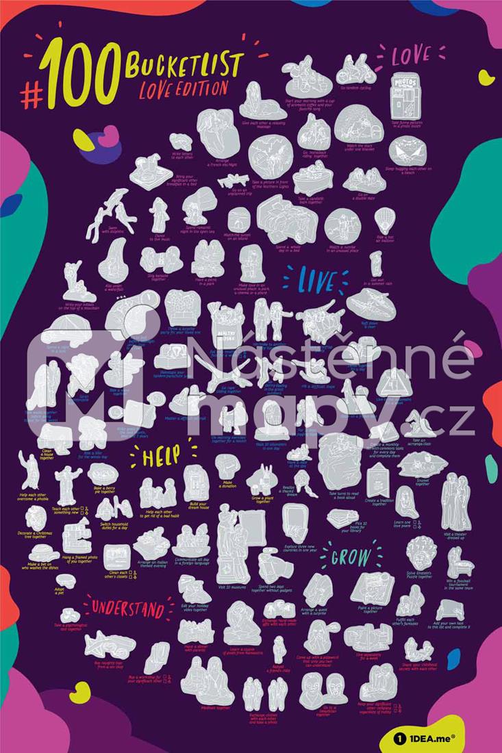 #100 Bucketlist Love Edition je nový stírací plakát, který dodá vašemu vztahu vzrušení. Stírací plakát obsahuje výzvy rozdělené do pěti kategorií: život, láska, porozumění, růst a pomoc. Dokončete společně výzvu, setřete ji a odhalte pestré barvy plakátu.
