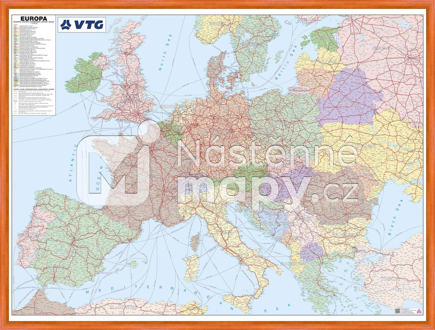 Nejpodrobnější mapa svého druhu zobrazuje železniční síť Evropy včetně trajektů, barevně rozlišené hranice států, vyznačení největších tarifních bodů, měřítko 1 : 2,69 mil., rozměr 140 x 105 cm.