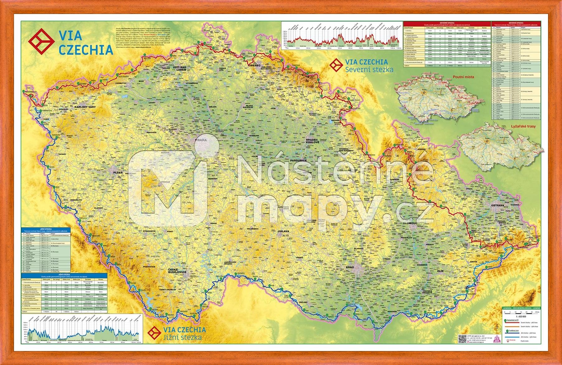 Tato unikátní a jedinečná zeměpisná nástěnná mapa České republiky obsahuje bohatou síť dálkových turistických a poutních tras Via Czechia. Mapa zobrazuje dvě nejdelší turistické trasy v ČR – Severní stezku a Jižní stezku, a to ve variantách pro pěší a pro cyklisty. Mapa rovněž obsahuje vyznačené etapové body, zákres alternativních lyžařských tras, poutní místa, výškové profily, kilometráž tras nebo seznam tisícových vrcholů. Tato krásně zpracovaná zeměpisná mapa potěší každého cestovatele, který rád objevuje krásu naší země. Přehledná nástěnná mapa může rovněž sloužit pro zakreslování absolvovaných úseků stezek Via Czechia nebo jako motivační a inspirativní dárek.