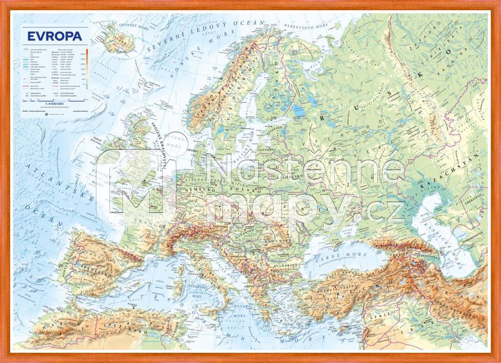 Nástěnná mapa Evropy obsahuje: