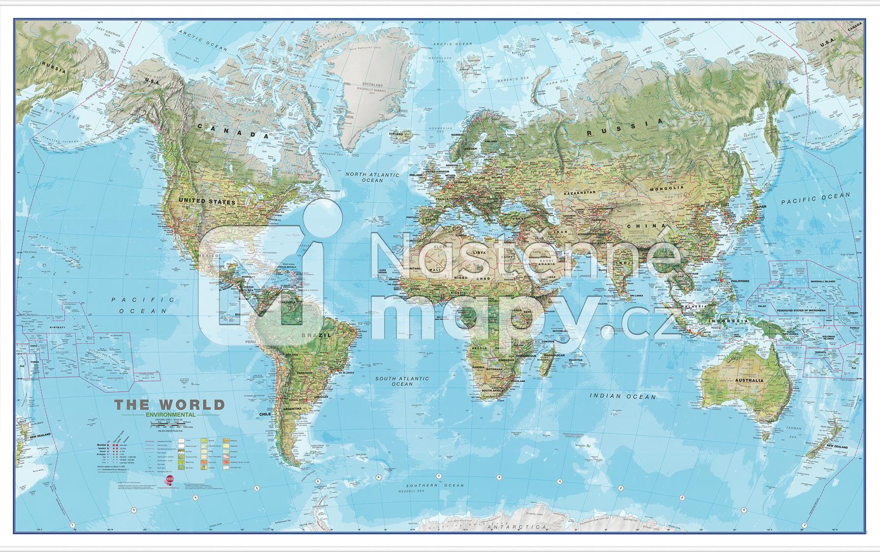 Tato krásně zpracovaná mapa belgické firmy Craenen je nejen klasickou zeměpisnou mapou světa, ale také mapou environmentální. Mapa se díky svému rozměru hodí do větších prostor nebo jako dominantní prvek do jakékoliv místnosti. Využít ji lze nejen jako poutavou dekoraci v kanceláři, ale díky řadě zeměpisných údajů také jako výukovou pomůcku.