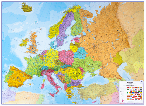 Nástěnná mapa Evropy s politickým členěním a reliéfní kresbou hor a pohoří.